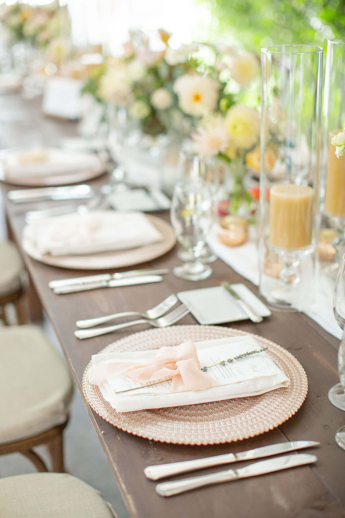 Their day was full of thoughtful details. The bride, a talented artist, painted sweet botanical icons that were beautifully transformed by Hazel Eye Designs into invitations, table numbers, and escort cards. The floral motif was carried throughout the expertly curated collection of blush bridesmaid dresses. The Aspen Branch, an Aspen-based floral designer, made the perfect setting even more spectacular with her lush design in rich pastels with pops of fall colors. The bridal party got ready at the groom's parents' Aspen home before an epic First Look in a field surrounded by fall's bright yellow aspen leaves.